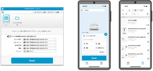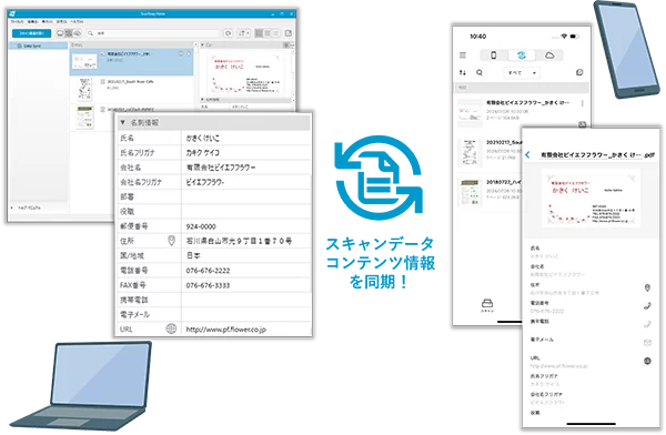 PC版/モバイル版のScanSnap Home間でスキャンデータを同期でき、PC・スマートフォンどちらでスキャンしても同じデータにアクセス可能。